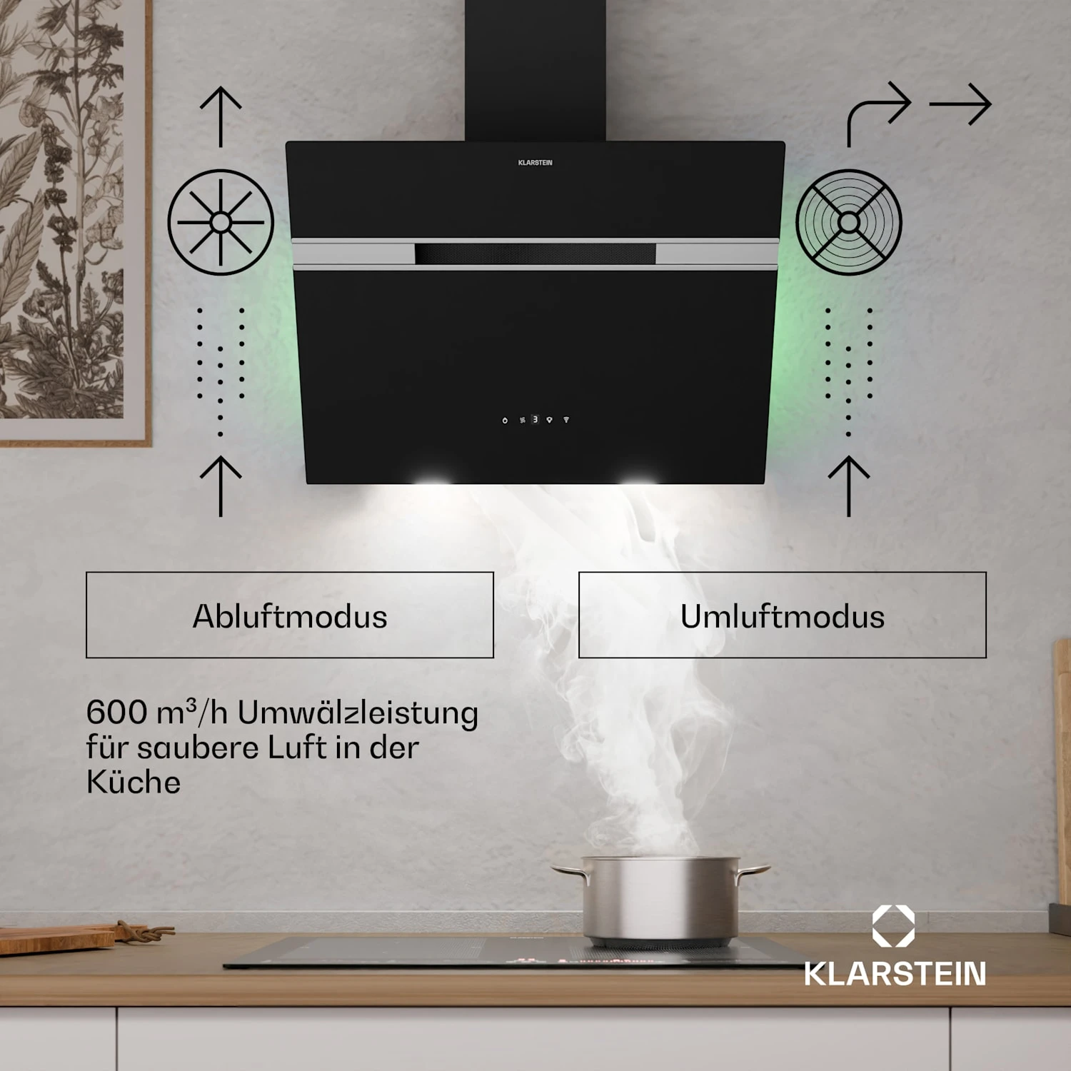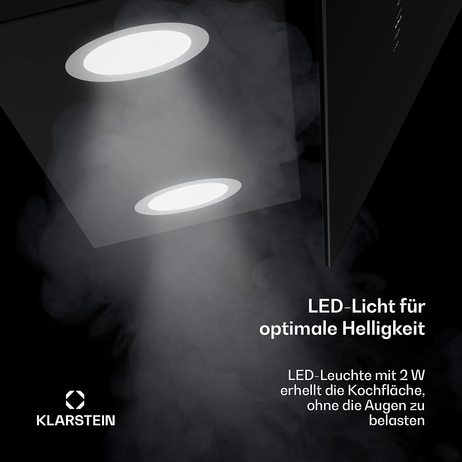 Jetzt kommen Glanz und Atmosphäre in die Küche – und ganz nebenbei beseitigt die smarte Klarstein Alina Dunstabzugshaube auch Dampf und Essensgerüche.