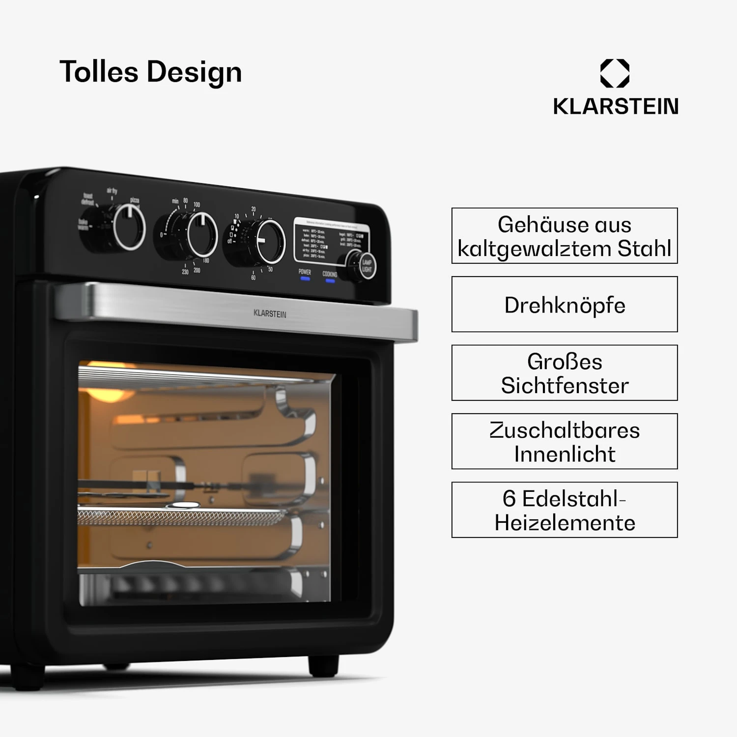 Vielseitige 2000 Watt Power: Mit 9 vorinstallierten Programmen kannst du frittieren, grillen, backen und mehr – alles in einem Gerät.