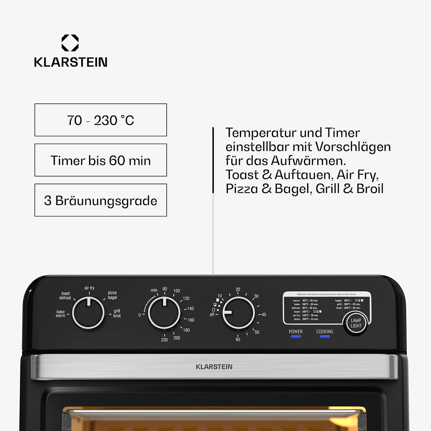 Programme: Heißluft-Frittieren, Toasten, Rottisserie, Grillen, Backen, Bagel, Pizza, Warmhalten, Auftauen