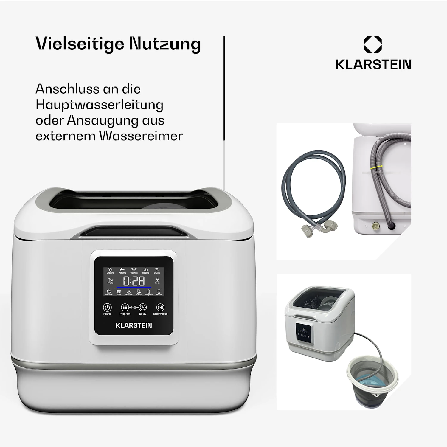 Der Klarstein SilentScrub Geschirrspüler bietet eine perfekte Lösung für Haushalte mit begrenztem Platz. Mit seiner kompakten Bauweise und den vielseitigen Einsatzmöglichkeiten passt dieser tragbare Tischgeschirrspüler perfekt in jede Küche. Er verfügt über ein digitales Touchscreen-Display, das die Auswahl aus sieben verschiedenen Waschprogrammen ermöglicht, darunter Normal, Eco, Speed, Heavy, Glass, Baby und Fruit. Die große Innenwanne bietet Platz für bis zu drei Maßgedecke und ist mit einem praktischen Besteckkorb sowie einer Sichttür ausgestattet. Dank seiner leisen Betriebsweise mit maximal 55 dB ist der SilentScrub einer der leisesten Geschirrspüler seiner Klasse. Die Installation ist denkbar einfach: Der Klarstein SilentScrub Geschirrspüler kann entweder an die Hauptwasserleitung angeschlossen oder mit dem im Lieferumfang enthaltenen externen Wasserbehälter betrieben werden. Dies macht ihn ideal für flexible Einsatzorte. Die nahtfreie Innenwanne ist auslaufsicher und der eingebaute Temperatursensor überwacht die Wassertemperatur, um optimale Reinigungsergebnisse zu erzielen. Die kinderleichte Bestückung von oben und die stabile Bauweise aus Kunststoff und gehärtetem Glas machen den Klarstein SilentScrub Geschirrspüler zu einem unverzichtbaren Helfer in jedem Haushalt.