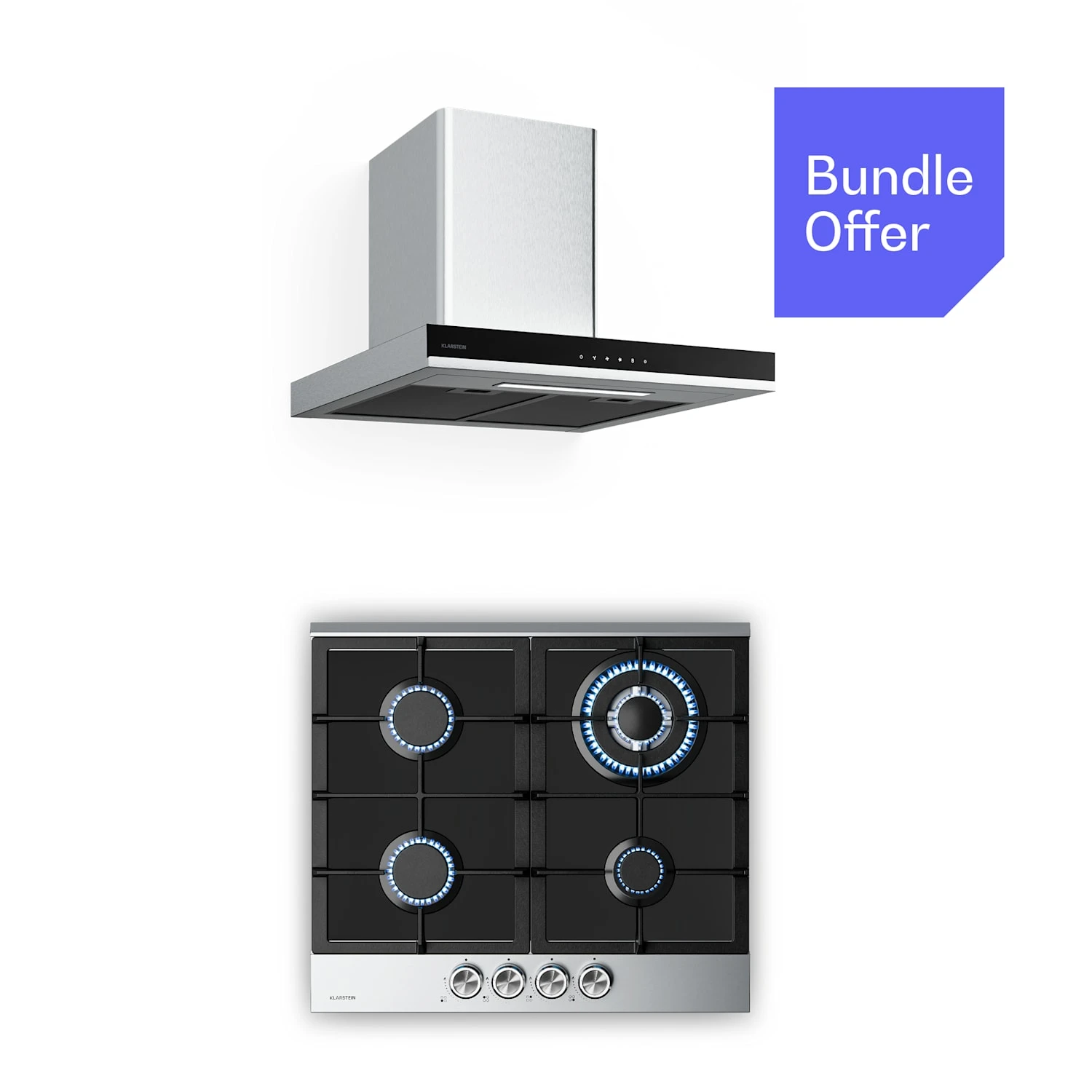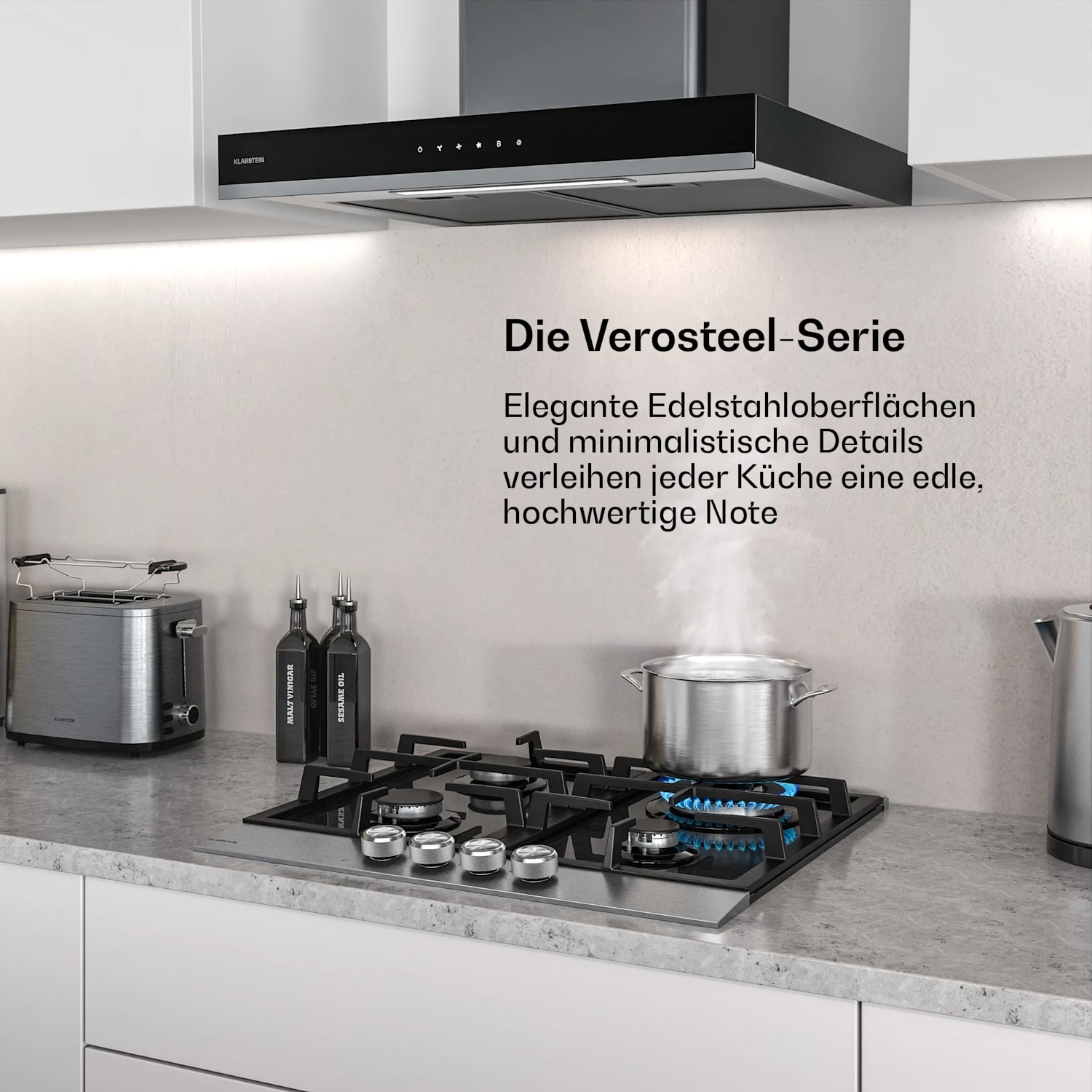Das Klarstein Verosteel Set aus Gaskochfeld und Kaminhaube vereint minimalistisches Design mit kraftvoller Leistung und energieeffizienter Technologie. Mit einer edlen Fusion aus glänzendem Schwarzglas und Edelstahloberfläche kombiniert es hochwertige und langlebige Materialien mit leicht zu reinigenden Oberflächen. Als Teil der Verosteel Designserie verkörpert dieses Set Minimalismus, Ruhe und klare Geometrie und ist damit ein natürliches Herzstück jeder Küche. Vier leistungsstarke und hochqualitative Brenner mit einer Gesamtleistung von 8000 W garantieren ein reibungsloses Kocherlebnis. Dank metallener Drehknöpfe ist das Gaskochfeld einfach zu benutzen, während die elektrische Zündung Streichhölzer oder ein Feuerzeug überflüssig macht. Das Gerät kann sowohl mit LPG- als auch mit Erdgas betrieben werden. Ausgestattet mit heller LED-Beleuchtung, bietet die Dunstabzugshaube klare Sicht über den Kochbereich. Entworfen für leistungsstarkes und leises Absaugen, hält sie die Küche mit bis zu 881,6 m³/h Luftstrom (im Boost-Modus) frisch und geruchsfrei. Sie möchten Ihre gesamte Küche mit schlichter Eleganz einheitlich einrichten? Entdecken Sie jetzt all unsere Verosteel-Geräte un d kreieren Sie ein edel-harmonisches Küchenerlebnis!