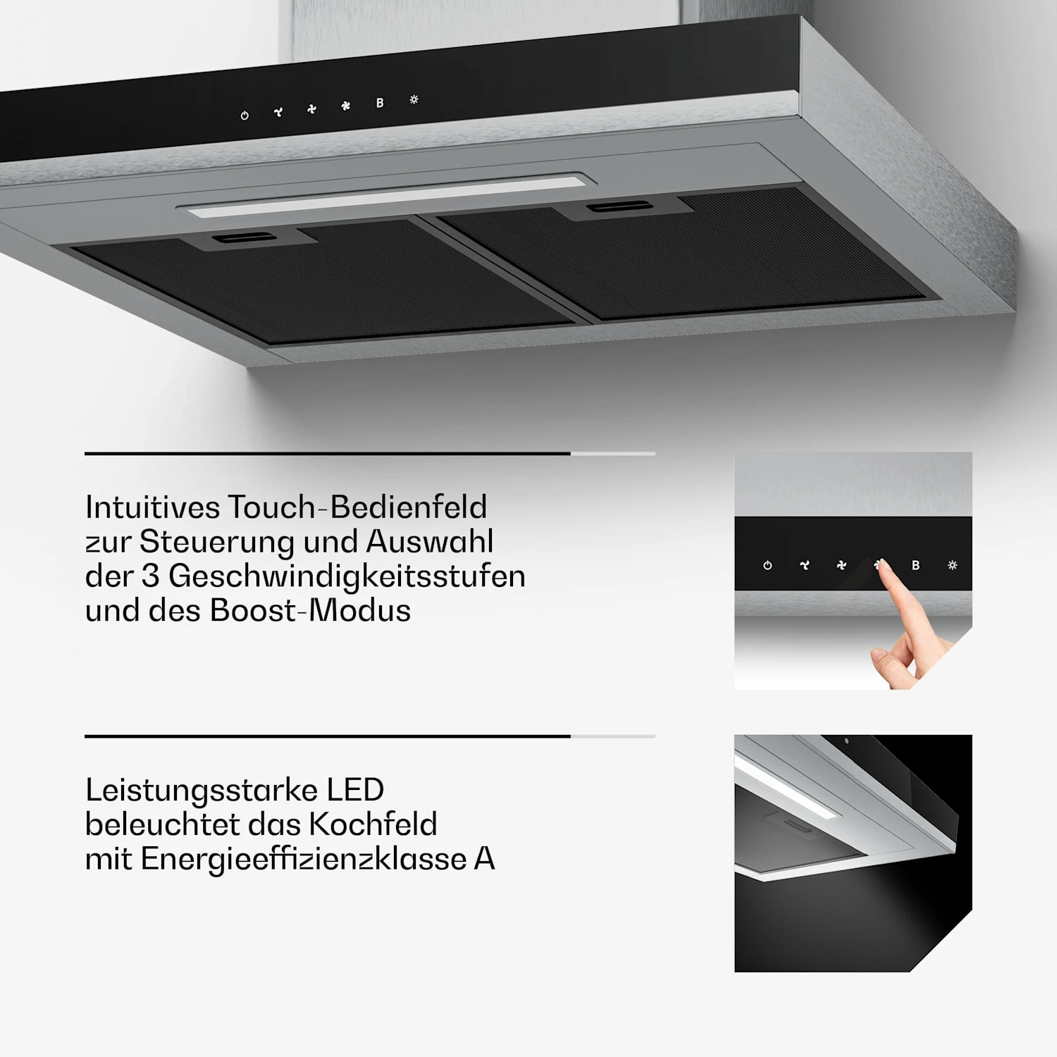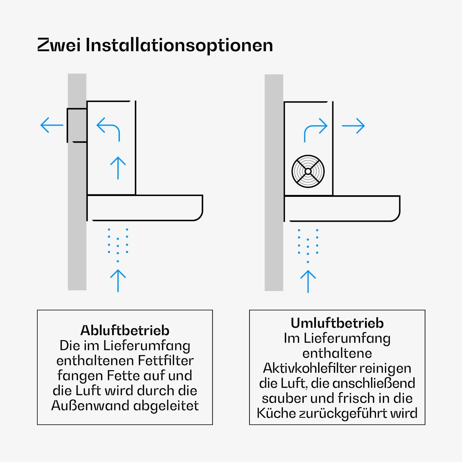 - Filtersystem: Spülmaschinengeeigneter Aluminiumfilter und 2 Aktivkohlefilter