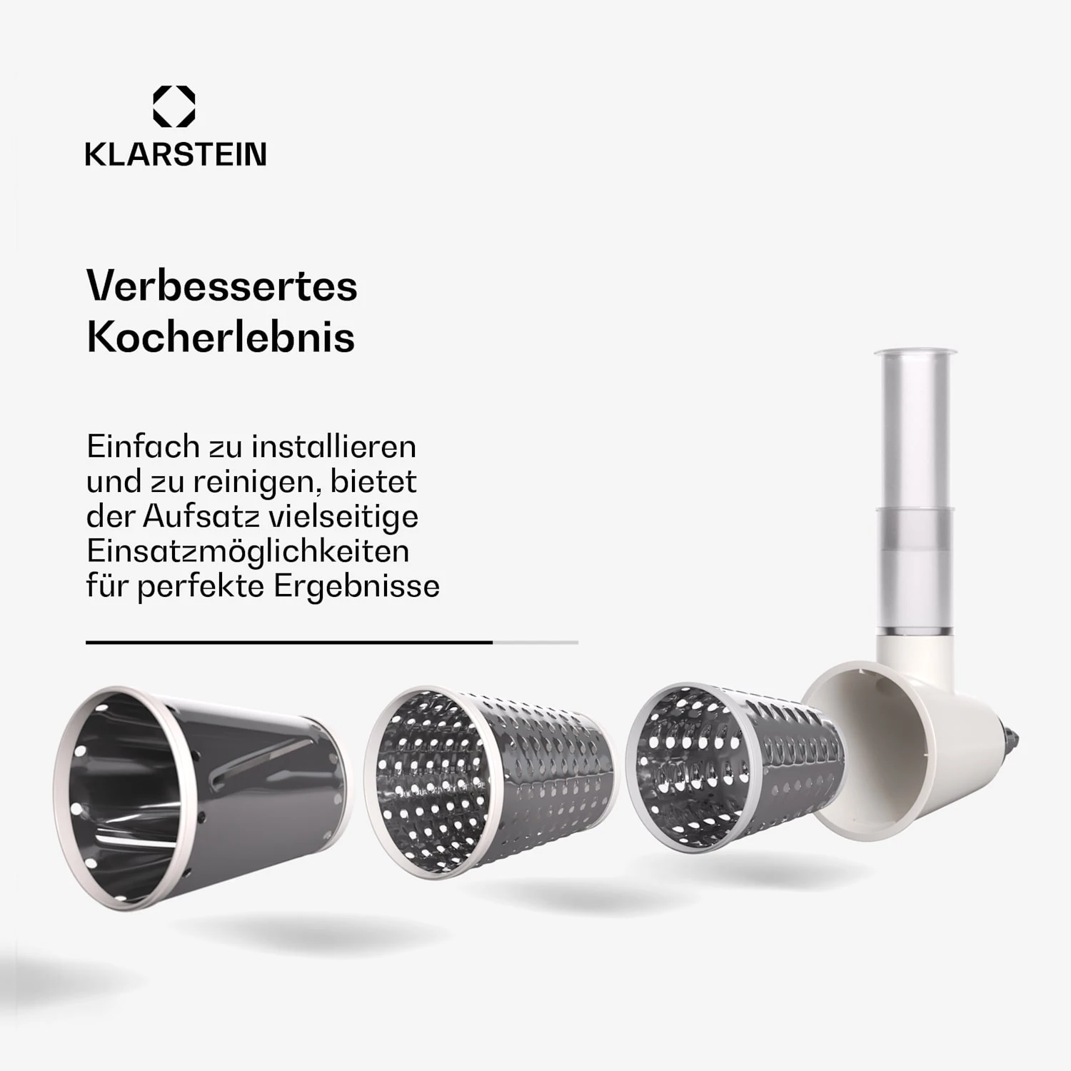 Vielseitige Klingenoptionen: Enthält eine 5mm Schneideklinge, eine 6mm grobe Reibklinge und eine 3mm feine Reibklinge für die Zubereitung verschiedener Zutaten.