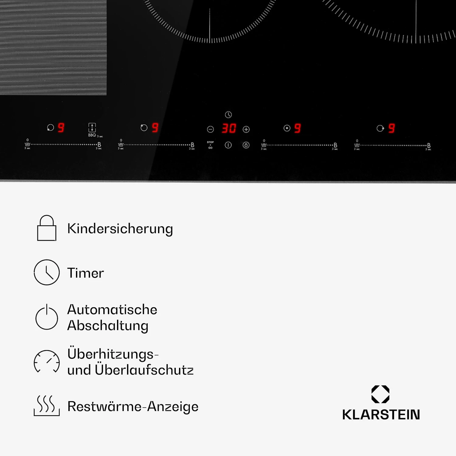 - Spar-Funktion: Kochzonen-Leistung wird automatisch reduziert, um Überlast zu vermeiden