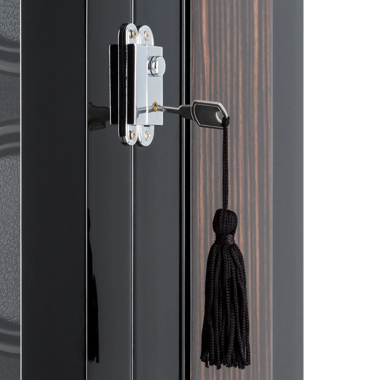eleganter Präsentations-Schaukasten aus Holz in schwarzer Lack-Optik mit schwarzer Samt-Innenbespannung und schwarzen Schaumkissen