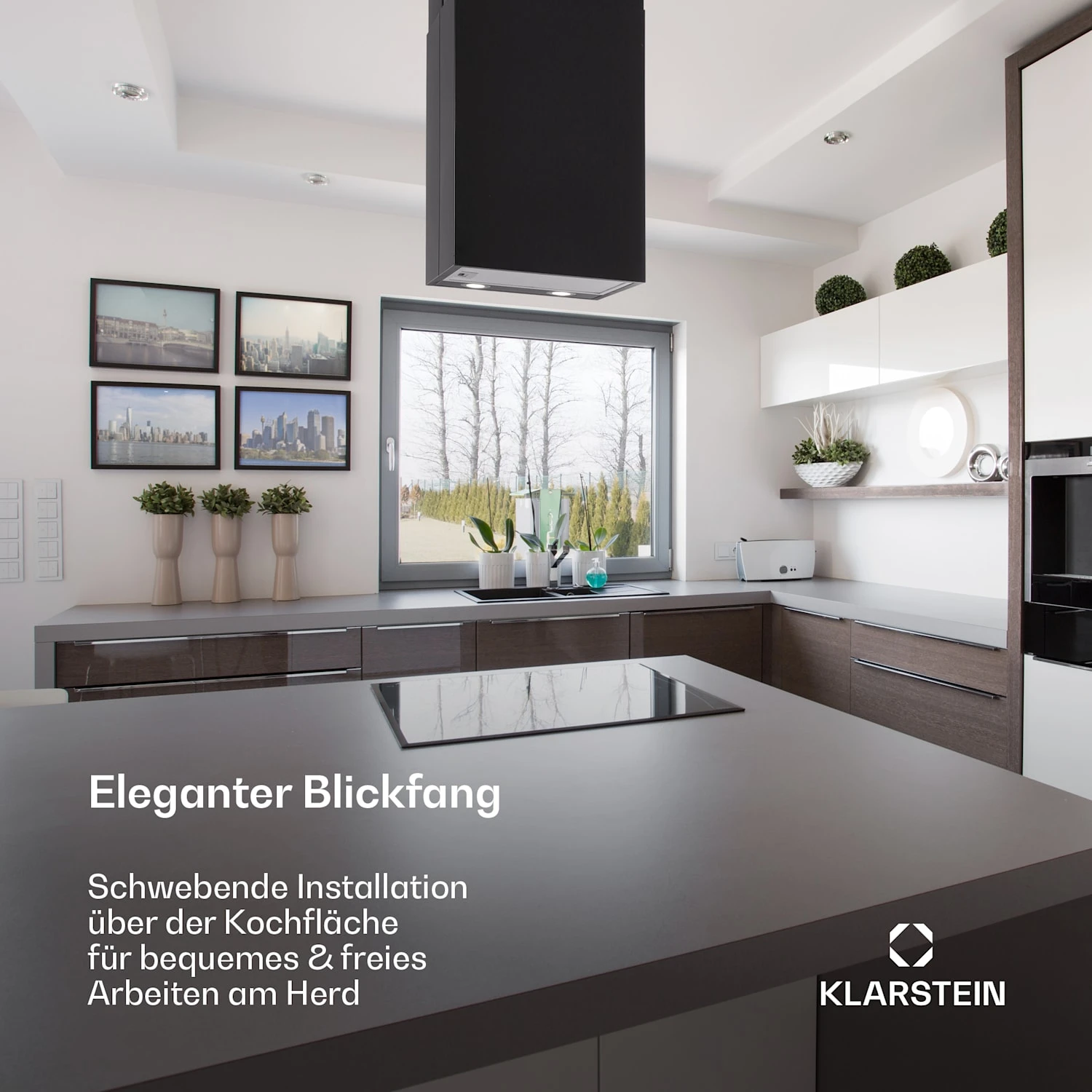 Der Fokuspunkt: Inselabzugshaube zur Deckenmontage über freistehenden Kochstellen